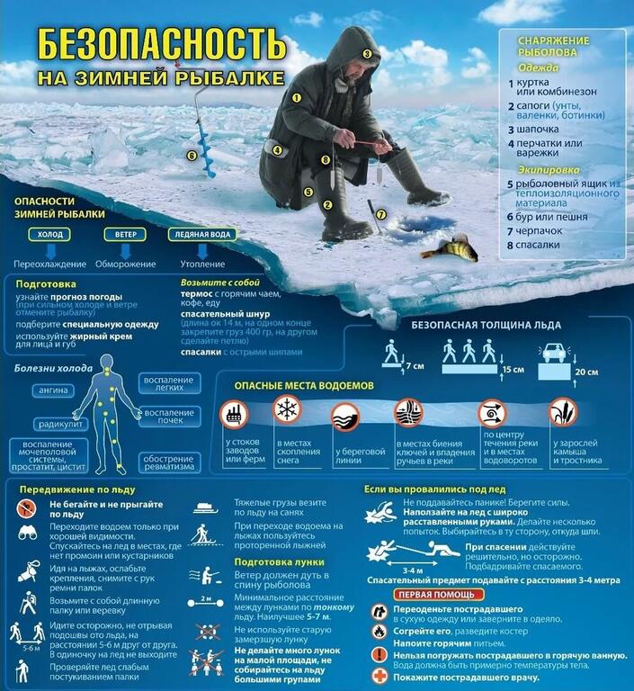 -Безопасным для человека считается лёд толщиною не менее 10 сантиметров в пресной воде и 15 сантиметров в солёной воде.