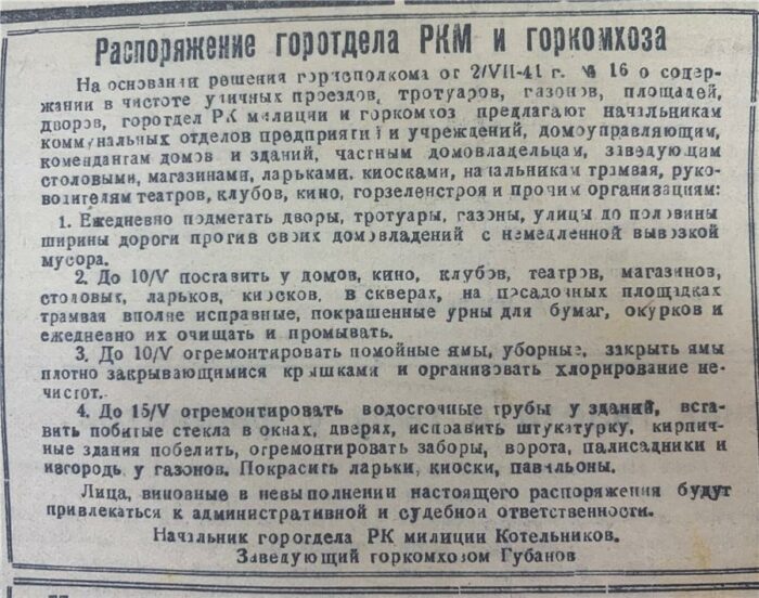 «Отремонтировать помойные ямы, уборные, закрыть ямы глубоко закрывающимися крышками и организовать хлорирование нечистот. Отремонтировать водосточные трубы у зданий, вставить побитые стекла в окнах, дверях, исправить штукатурку, кирпичные здания побелить, отремонтировать заборы, ворота, палисадники и изгородь у газонов. Покрасить ларьки, киоски, павильоны. За невыполнение – ответственность вплоть до административной и судебной», – говорится в распоряжении.