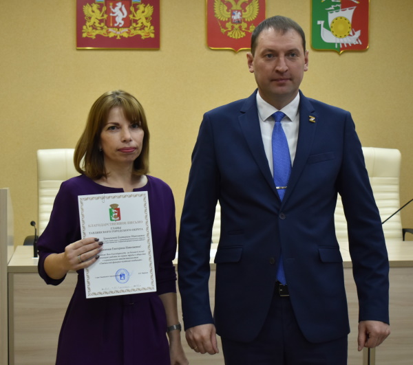 В начале оперативного совещания глава округа, секретарь местного отделения ВПП «ЕДИНАЯ РОССИЯ» В.В. Миронов поощрил благодарственным письмом главы Тавдинского городского округа начальника отдела охраны труда и промышленной безопасности ООО «Тавдинский фанерно-плитный комбинат» Е. Н. Хрипачеву за большой вклад в организацию работы по охране труда в ООО «Тавдинский фанерно – плитный комбинат». Валентин Викторович отметил, что благодаря качественной работе жизнь и здоровье работников предприятия в безопасности, пожелал продолжать продуктивную работу.