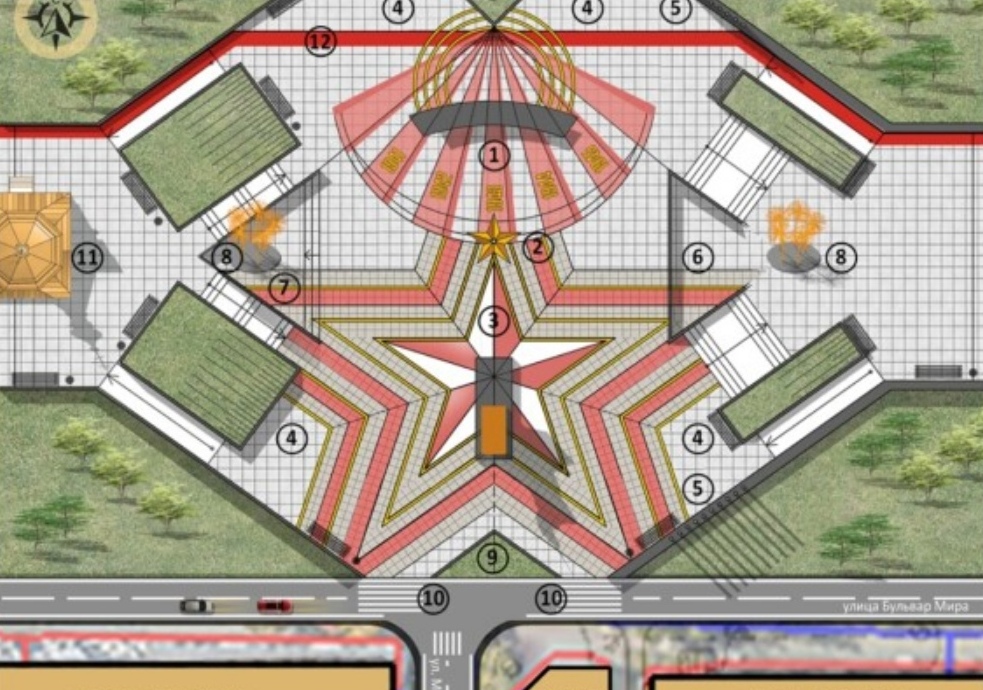 Выделены дополнительные четыре тематические зоны Памяти, выкладка тротуара в виде звезды, чтобы подчеркнуть существующие мемориалы.