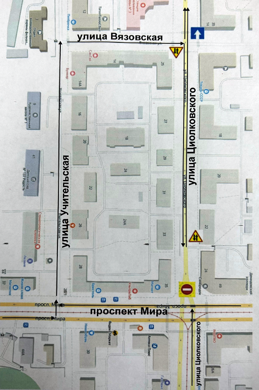 С 1 по 4 июня будут менять теплосети между домами №24 и №35 на улице Циолковского. Без остановки движения ремонт коммуникаций будет невозможен. Поэтому власти закроют прямой проезд по Циолковского в сторону Пархоменко, а также повороты с проспекта Мира. Объехать этот участок можно будет по улицам Учительская и Вязовская. С последней будет открыт правый поворот на Циолковского, чтобы обеспечить подъезд к жилым домам. В целом же прямой проезд по Мира, а также поворот в сторону моста у ЦУМа никак ограничиваться не будет (все перекрытия отражены на схеме).