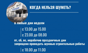Строительные работы, которые сопровождаются шумом, запрещено проводить в период с 18.00 до 11.00 утра с пятницы по воскресенье и в нерабочие праздничные дни.