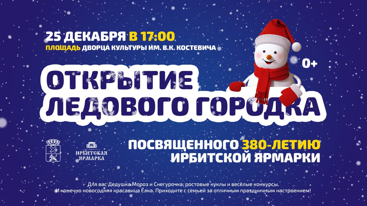 Мальчишки и девчонки, а также их родители, приглашаем Вас всей семьёй на открытие Главного городского ледового городка на площади Дворца культуры им. В.К. Костевича 25 декабря 2022 года в 17:00. Для вас Дедушка Мороз и Снегурочка, ростовые куклы и весёлые конкурсы. И конечно новогодняя красавица Ёлка. Приходите с семьей за отличным праздничным настроением! В этом году ледовый городок на площади Дворца культуры посвящен празднованию 380-летия Ирбитской ярмарки в 2023 году.