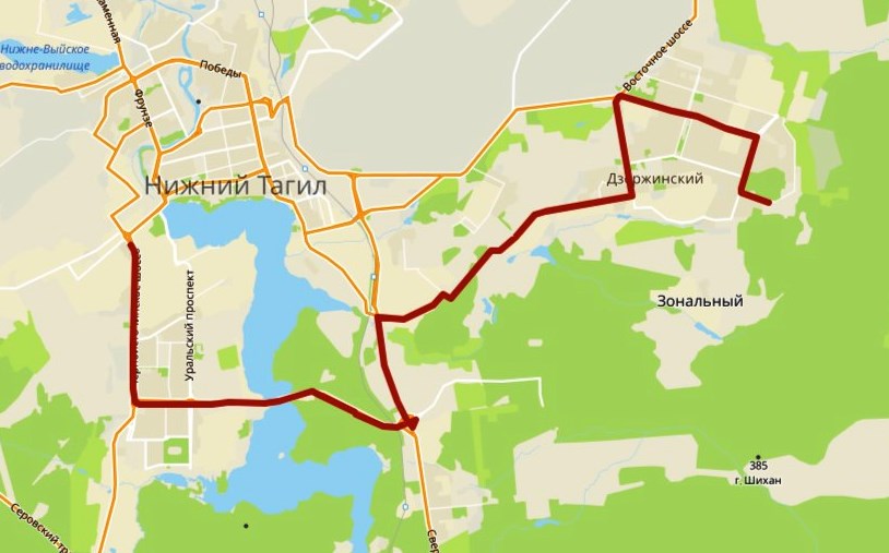 В сторону Гальянки: улица Максарёва, улица Зари, проспект Вагоностроителей, Восточное шоссе, улица Юности, улица Алтайская, улица Зеленстроевская, улица Садоводов, автомобильная дорога Южный подъезд к городу Нижний Тагил, Луганский проспект, Октябрьский проспект, Черноисточинское шоссе.
