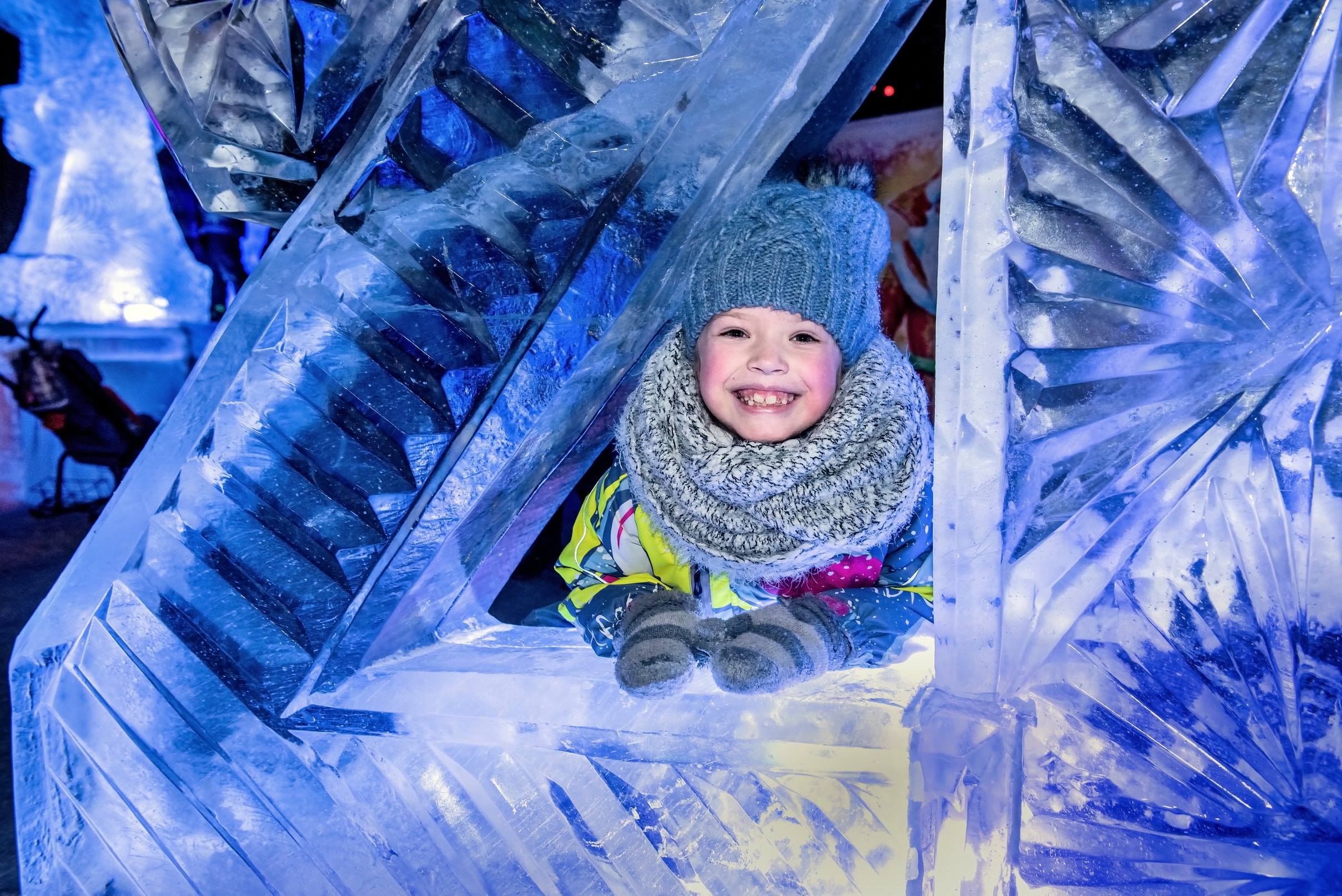 Большая горка в виде драги, каток с фигурами гидроузла плотины Нижнетуринского пруда, лабиринт на фоне Трехсвятительского храма, большой герб округа, вырезанный изо льда.