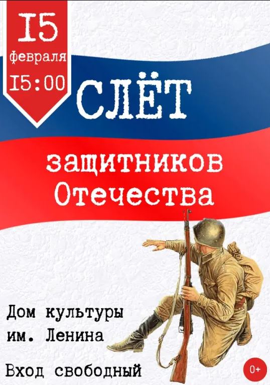 Приглашаем вас на Слет защитников Отечества, который состоится 15 февраля 15:00 в Доме культуры им. Ленина.