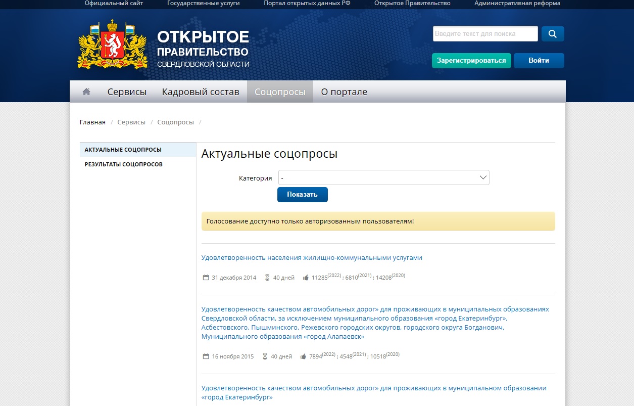 На портале «Открытое Правительство Свердловской области»: http://open.midural.ru/ функционирует раздел « Соцопросы », где гражданам предоставлена возможность участия в опросах по оценке населением эффективности деятельности руководителей органов местного самоуправления муниципальных образований, расположенных на территории Свердловской области.