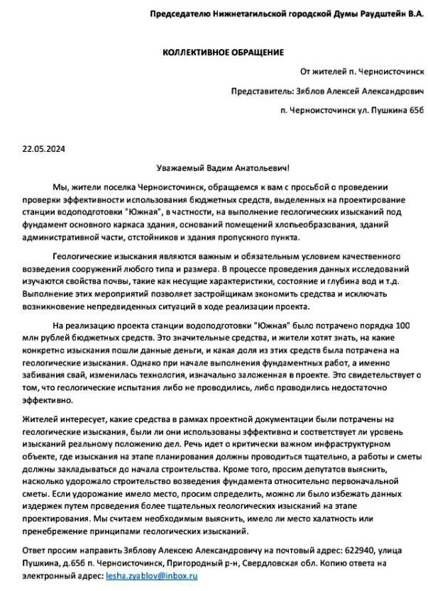 Обращение жителей Черноисточинска в думу Нижнего Тагила