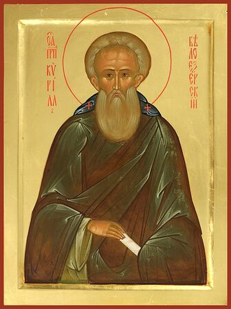 Преподобный Кирилл, игумен Белоезерский (в миру Косма) родился в Москве у благочестивых родителей. В юные годы он остался сиротой был отдан в Симонов монастырь, где принял постриг от святого Феодора с именем Кирилл. Избегая славы человеческой, преподобный временами стал юродствовать.