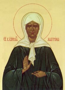 К служению Христову от чрева матерня предызбранная, праведная Матроно, стезею скорбей и печалей шествующи, твердую веру и благочестие явивши, Богу угодила еси. Темже, почитающе память твою, молим тя: помози и нам в любви Божии пребывати, старице блаженная.