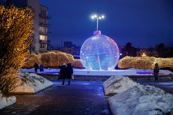В сквере начал работать пятиметровый мультимедийный «Новогодний шар». Каждые десять секунд на арт-объекте появляется один из 23 праздничных узоров и надпись «Екатеринбургу 300 лет».