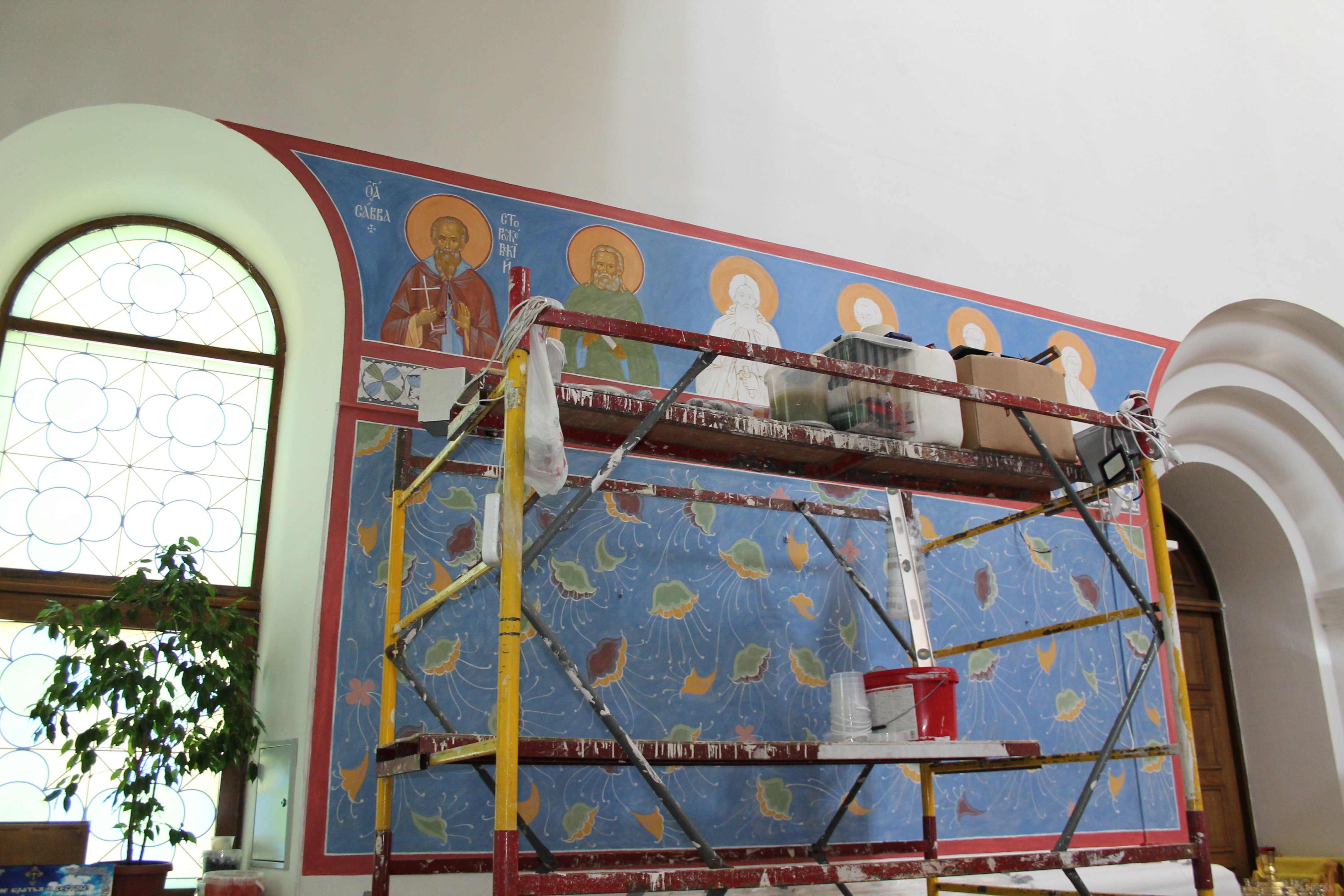 Уже около месяца здесь проводится роспись стен – по нижнему краю появляется растительный орнамент, а сверху – лики святых.