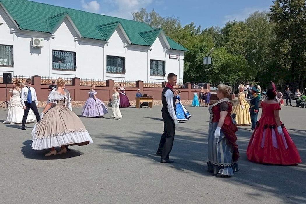 В исторических костюмах местные жители танцуют под классическую музыку той эпохи, которая оборвалась с началом Октябрьской революции рядом с Троицкой церковью и памятником святой мученице Елисавете Федоровне.