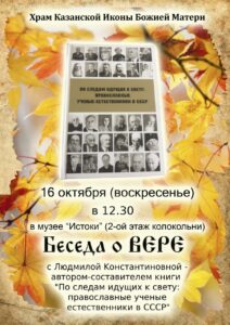 16 октября, в воскресенье в 12:30 состоится встреча с автором-составителем книги «По следам идущих к свету: православные ученые естественники в СССР», сотрудницей Миссионерского отдела Епархии, кандидатом биологических наук, доцентом Людмилой Константиновной Конышевой.