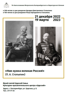 21 декабря 2022 года в 11:00 в Музее святой Царской семьи Культурно‑просветительского цента «Царский» состоится открытие выставки «Нам нужна великая Россия» (П.А. Столыпин).