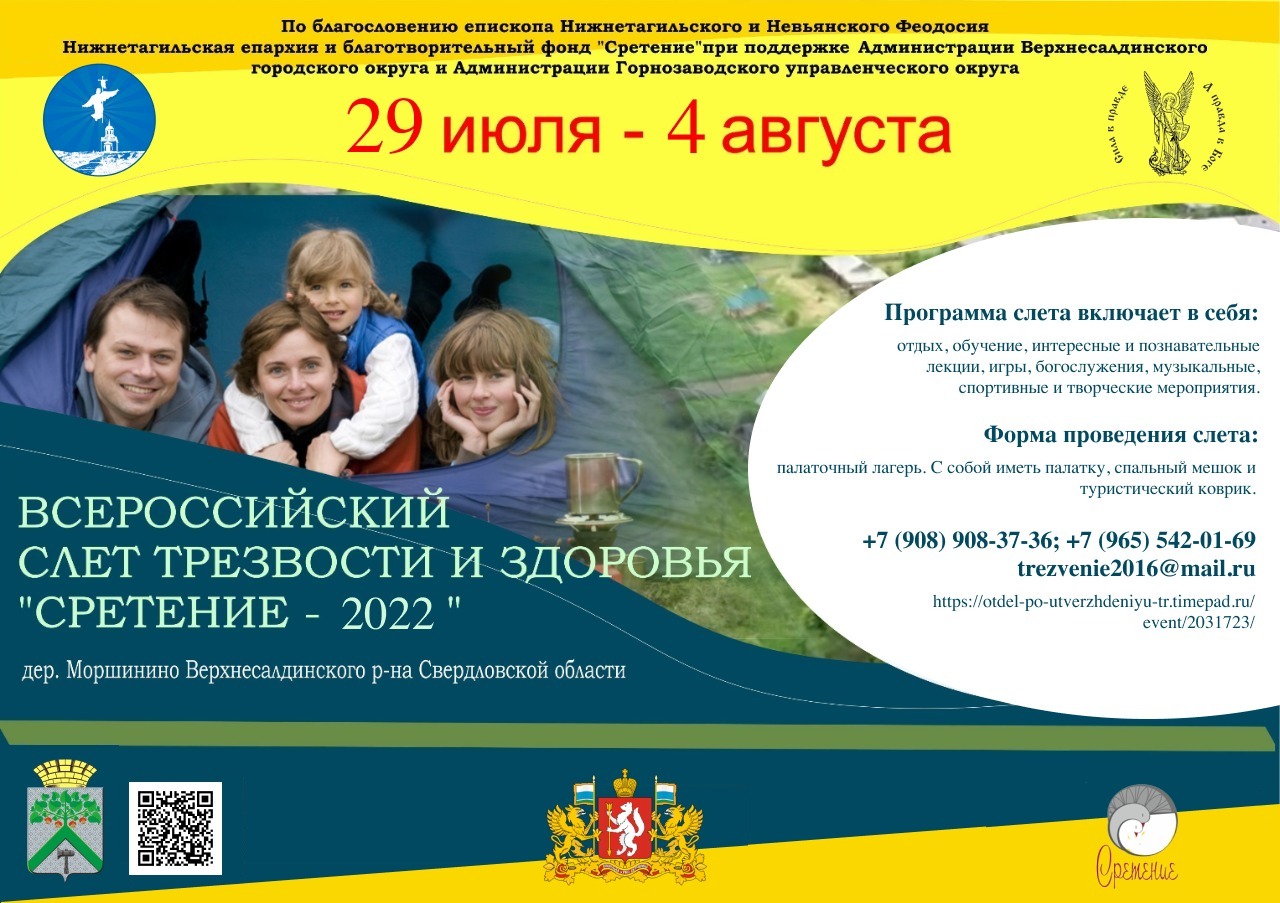 С радостью сообщаем вам, что в этом году Всероссийский Слет Трезвости и Здоровья «Сретение-2022» пройдет с 29 июля по 4 августа в районе дер. Моршинино Верхнесалдинского района Свердловской области. Приглашаем всех желающих провести время всей семьей интересно и полезно в трезвой дружной обстановке.