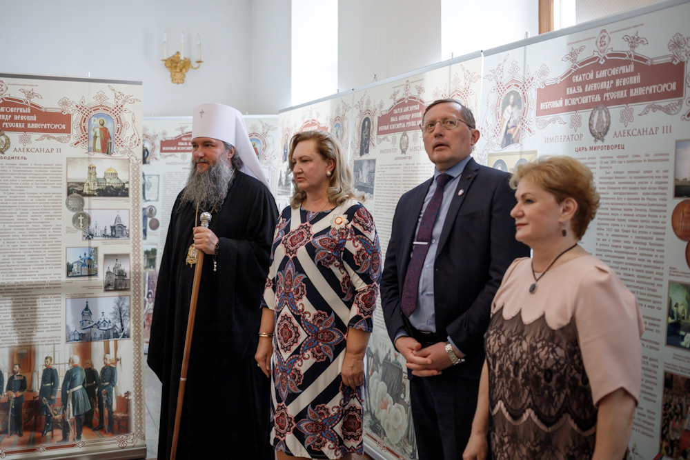 Владыка подчеркнул что сегодня для нас важно, чтобы мы также «вдохновлялись жизнью, житием и подвигом святого Александра Невского». — И те вызовы, которые сегодня перед нами стоят, мы, вдохновившись, принимали, отражали и несли победу. Я бы хотел пожелать, чтобы эта выставка была пропущена через наше сердце. Кого мы можем — привлечь, поделиться, пригласить, открыть, поделиться, вдохновиться и продолжать дело, которое совершал 800 лет назад святой князь Александр Невский, — отметил архипастырь. С приветственными словами также выступили вице-губернатор Павел Владимирович Креков, председатель Наблюдательного совета фонда содействия возрождению традиций милосердия и благотворительности «Елисаветинско-Сергиевское просветительское общество» Анна Витальевна Громова и заведующая Музеем святой Царской семьи Культурно-просветительского центра «Царский» Татьяна Сергеевна Романюк.В рамках открытия выставки митрополит Евгений и старший священник Храма-Памятника на Крови протоиерей Максим Миняйло были награждены Юбилейным знаком к 10-летию Фонда «Елисаветинско-Сергиевское просветительское общество» за просветительские труды.