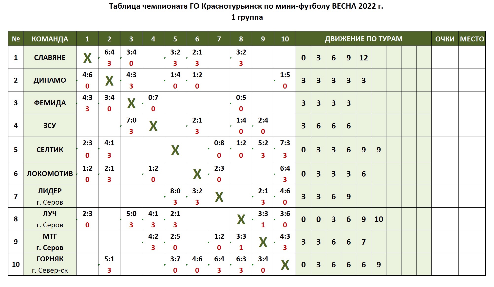 1 группаВ сильнейшем дивизионе свое выступление начал главный фаворит — «Лидер» из Серова — и уже во втором матче проиграл середняку группы. «Леща» чемпиону дали футболисты североуральского «Горняка», одержав победу со счетом 6:4. Свою встречу в упорной борьбе уступили и «золотодобытчики» — 1:2 серовскому «Лучу». «Селтик» обыграл «Динамо», а потом попал под каток разозленного «Лидера» — 0:8. На происходящее (пока что со стороны) спокойно смотрели игроки команды «Славяне», которые победили 6:4 «Динамо» и единолично возглавили таблицу. На второй месте в таблице идет «Луч», сыгравший вничью 3:3 со своими земляками из МТГ.