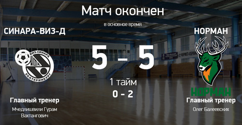 Парибет-Высшая лига | Плей-офф, 1/8 финала. СК «ВИЗ-Синара», Екатеринбург 16 апреля 2022 года Синара (Екатеринбург) – Норман (Нижегородская область) 5 : 5 ( 0 : 2 ) Голы: 0:1 Гребенщиков (9), 0:2 Самусенко (19),