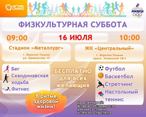 Напоминаем, что 16 июля, в День города, «Физкультурные субботы» вновь пройдут на двух площадках. Всех желающих ждут на двух площадках на бесплатные тренировки.