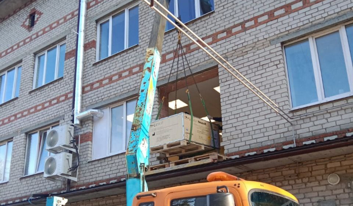 КТ пришлось поднимать на второй этаж через окно, временно демонтировав оконный проем и стену под ним.