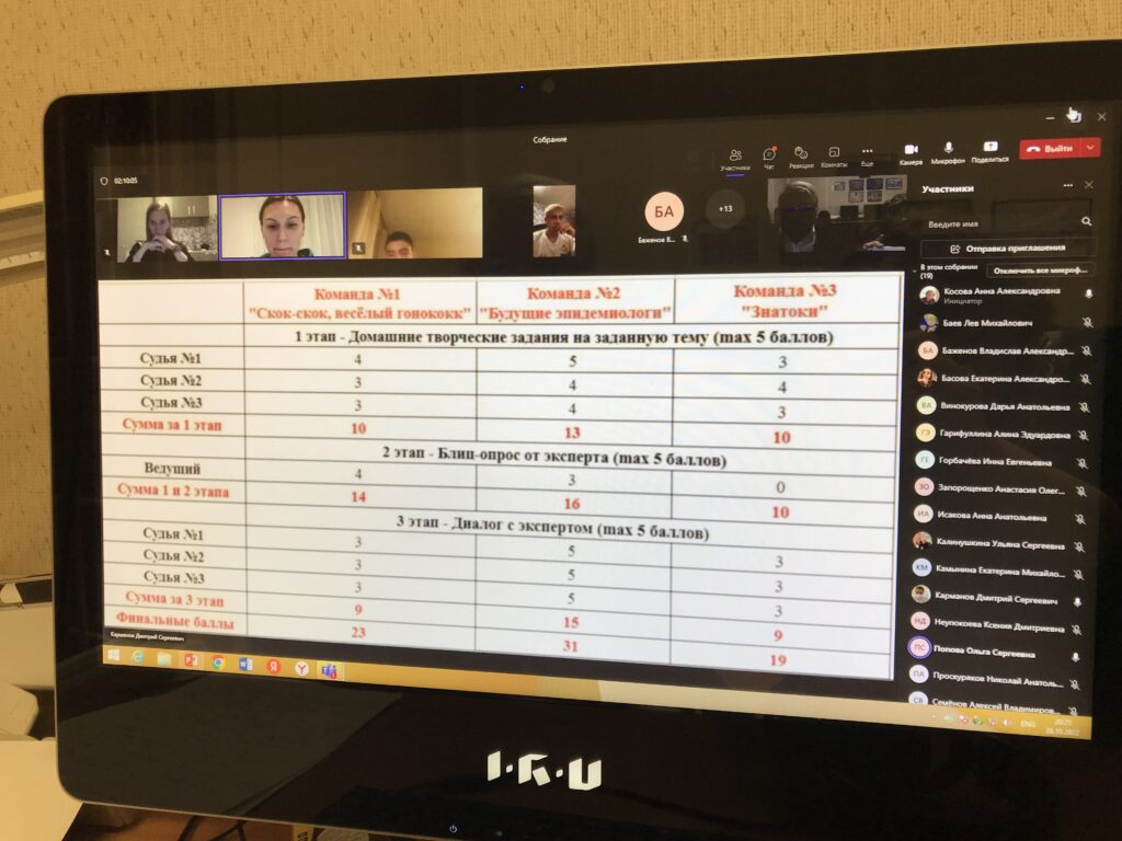 Команды подготовили домашнее задание на темы: «Что произойдет с миром, если исчезнут микробиологические лаборатории?», «Зачем в медицине нужны клинико-диагностические лаборатории?», «Как можно оценить здоровье человека?», а Владимир Викторович и жюри оценивали качество подготовленных командами выступлений. В этом этапе в жюри приняли участие выпускники факультета 2022 года – Дарья Винокурова и Анна Исакова.