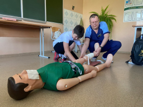Врачи провели обучающие занятия для школьников по профилактике травматизма и оказанию первой медицинской помощи. Фельдшер отделения скорой медицинской помощи Александр Ершов показал мастер-класс по проведению сердечно-легочной реанимации, технике искусственного дыхания, использованию кровоостанавливающего жгута.