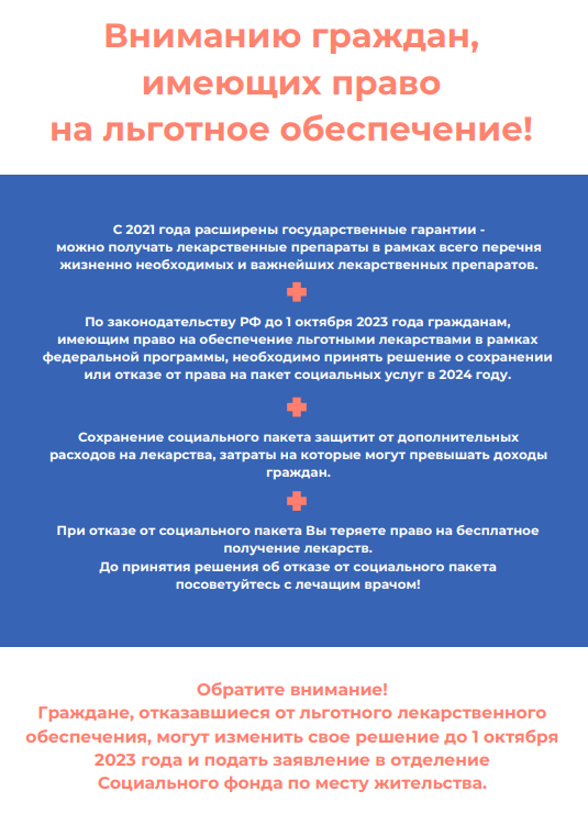 В соответствии с законодательством Российской Федерации до 1 октября 2023 года гражданам, имеющим право на обеспечение льготными лекарственными препаратами в рамках федеральной программы, необходимо принять решение о сохранении или об отказе от права на пакет социальных услуг в 2024 году.